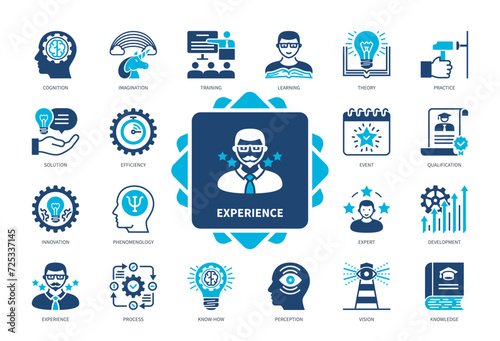 Experience icon set. Phenomenology, Perception, Development, Imagination, Learning, Theory, Practice, Innovation. Duotone color solid icons
