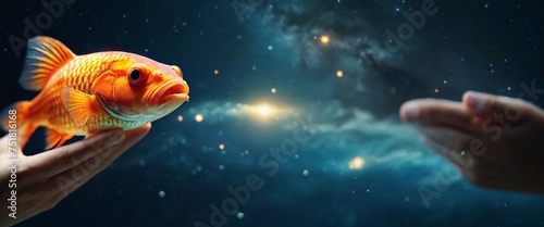 Expert hand of glod fish, Business or ecology concept, In the background is the Milky Way galaxy. Stylish in the style of double exposure