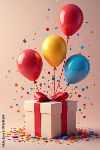 Exploding gift box; vibrant balloons & confetti spill out , celebration supplies, holiday, summer