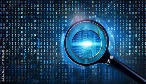 exploration of digital data through a magnifying glass against a backdrop of binary code
