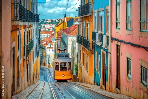 Explore the vibrant charm of Lisbon, Portugal, through this stunning photograph. The image captures the iconic cityscape of Lisbon, with its colorful buildings, historic trams, generative ai
