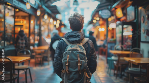 Exploring a lively pedestrian street, filled with cafes, a traveler with a backpack walks forward.