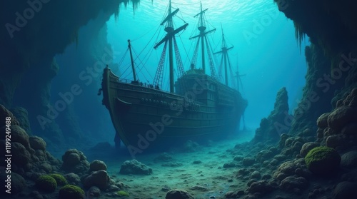 Exploring the sunken shipwreck beneath the ocean underwater scene marine environment deep sea mystery