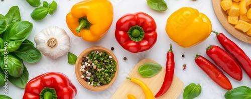 vegetable, pepper, garlic, basil, chili, spice, cookery, health, nourishment, cooking, favor, ingredient, organic, fresh, harvest, seasonal, green, red, yellow, herb, aroma, diet, epicure, vibrant, colours, local, sustainable, dish, meal, preparation, chopping, variety, texture, creativity, wholesome, freshness, presentation, simple, nature, culinary, vegetarian