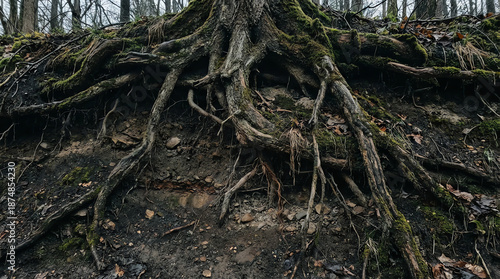 root, tree, erosion, forest, dirtied, nature, moss, timberland, decay, autumn, winter, environment, landscape, organic, ecosystem, dirt, ground, texture, wilderness, natural, seasonal, growth, plant, moisture, tree branch, bark, terrain, weather, bare, survival, exposure, leaf, timber, habitat, brown, green, dry, rugged, trail, slope, fallen, naturalist