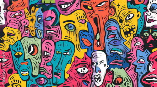 Expressive Hand-Drawn Faces in Colorful Doodle Pattern