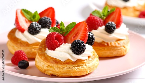 tartlet, berry, dessert, pastry, cream, strawberry, raspberry, blackberry, mint, sweet, delicious, epicure, bakery, confection, confectionery, bake, baked, plate, pink, background, fresh, bright, tasty, breakfast, brunch, snack, treat, cake, homemade, elegant, culinary, cookery, food, fruit, light, airy, isolated