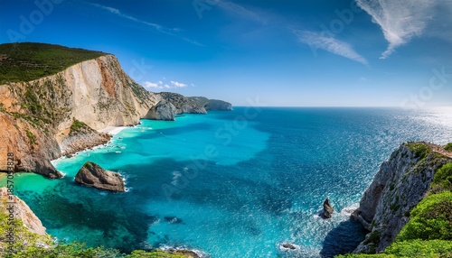 exquisite coastal panorama revealing pristine turquoise waters meeting rugged cliffs under a