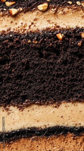 Exquisite layer cake with espresso cream frosting and hazelnut praline filling in rich textures