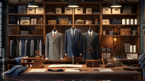 Exquisite Tailored Suits Bespoke Workshop with Fine Fabrics Thread Spools and Business Cards