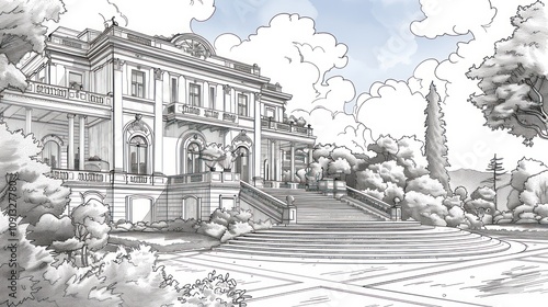 luxury home, vignetting, drawing, illustration, architecture, exterior, building, house, staircase, garden, landscaping, tree, design, classic, european, luxury, elegant, grand, estate, palace, view, detailed, perspective, artistic, landscape, foliage, manicured, ground, property