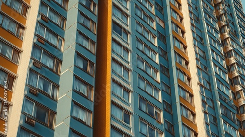 building, residential, exterior, facades, window, blue, orange, architecture, apartment, highrise, urban, city, modern, geometric, abstract, structure, repetitive, pattern, wall, skyscraper, contemporary, glasses, curtain, housing, development