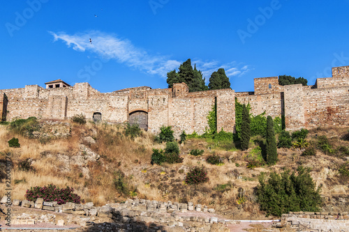 External view of Alcazaba Walls - palatial fortress in Malaga built in XI century. Fortress palace, whose name in Arabic means citadel, is one of city's historical monuments. Malaga, Andalusia, Spain.