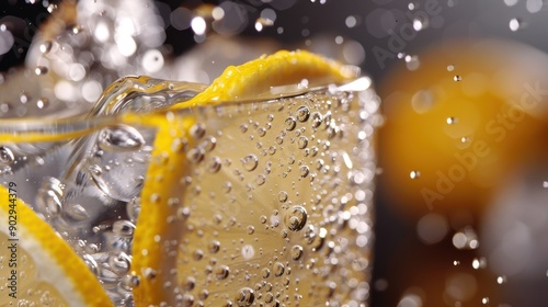 Extreme close-up of a refreshing drink in a glass, highlighting the lemon slices and bubbles, with the playful sparkles and effervescent texture vividly captured.