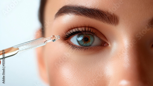 Extreme close-up shot of good-looking young woman puts skin care serum on her cheek from dropper on white background
