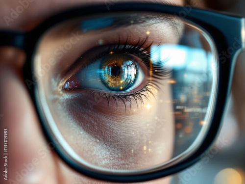 Eye, Glasses, Reflection, Technology, Digital, Screen, Close-up, Iris, Pupil, Eyelashes, Blue, Green, Code, Data, Computer, Monitor, Focus, Detail, Vision, Modern, Cyber, Gaze, High-tech, Glass, Lens,