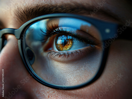 Eye, Glasses, Reflection, Technology, Digital, Screen, Close-up, Iris, Pupil, Eyelashes, Blue, Green, Code, Data, Computer, Monitor, Focus, Detail, Vision, Modern, Cyber, Gaze, High-tech, Glass, Lens,