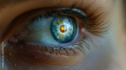 Eyes of woman with microchip circuit board, artificial intelligence development concept