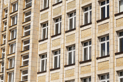 Facade of apartment building. Rows of windows yellow brick wall. Urban architecture with repeating structure. Modern residential exterior. Geometric design in daylight. Vertical residential symmetry.