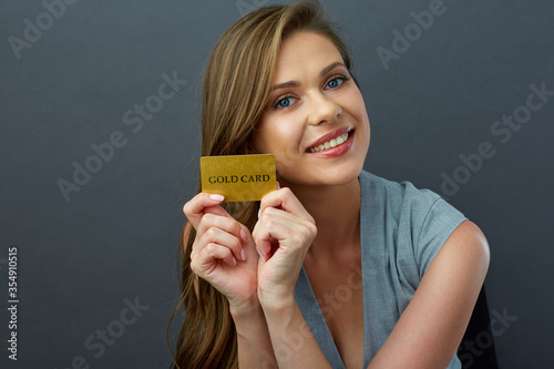 Face close up portrait of woman with big toothy smile holding credit card.
