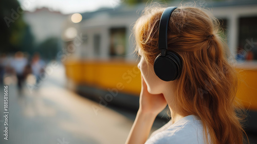 Faceless girl with headphones listening to music waiting for streetcar, urban commuter with audio entertainment, public transportation leisure, defocused person with earphones, wit