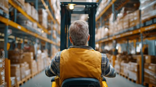 Faceless logistics worker operating forklift, inventory movement, warehouse storage facility, industrial equipment, material handling, distribution center operations , with copy sp
