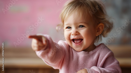 Faceless surprised toddler with chubby cheeks pointing left in amazement showing pure joy and wonder surrounded by defocused soft pink backdrop, child expression, innocent