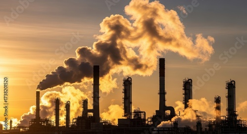 pollution, industry, smoke, environment, air, factory, chimney, sunset, silhouette, emission, fume, atmosphere, power, plant, toxic, global, warming, climate, change, carbon, dioxide, fossil, fuel, energy, refinery, crude oil, chemical, industrial, process, smog, cloud, sky, sun, morning, evening, dark, waste, resource, harmful, impact, damage, crisis, cleanup, contamination, oil, manufacturing, infrastructure, landscape