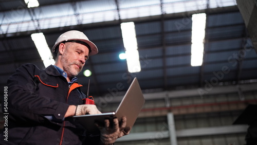Factory engineer or foreman worker maintaining check equipment parts in factory.
