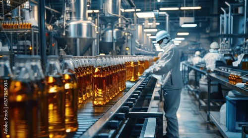 Factory industrial, A Beverage factory production line supervisor and employees working together on beverage production line in beverage factory, industrial background.