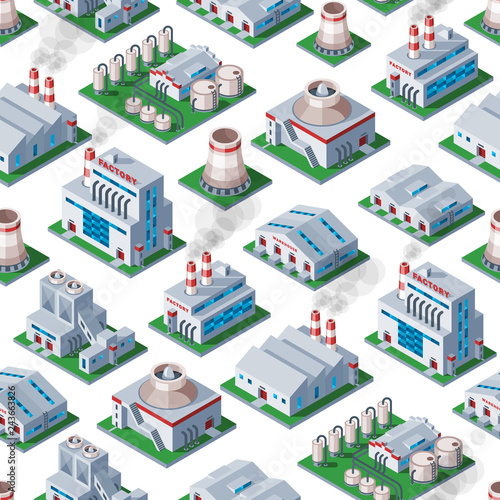 Factory vector industrial building and industry manufacture with engineering power illustration isometric map of manufacturing construction producing energy or electricity on background
