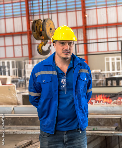 factory, men at work, man, safety, equipment, warehouse, helmet, industrial, protective, manufacturing, job, construction, blue-collar, manual labor, uniform, workwear, safety-gear, mill-hand, male, occupation, labor, technology