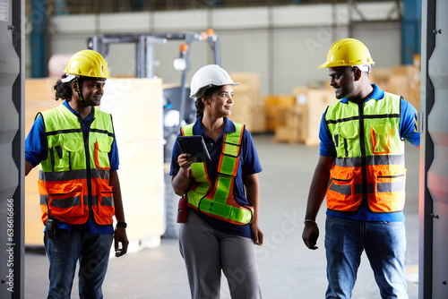factory workers or engineers talking and looking at inside container in the warehouse storage
