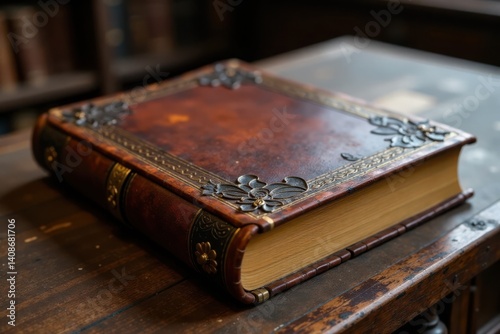 Faded leather-bound book on a vintage wooden desk, bookshelf, vintage