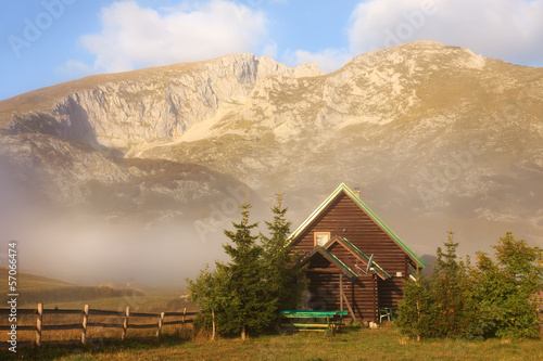 bungalow, fence, mountain hut, house, courtyard, architecture, mountain, mist, fairy tale, tree, landscape, morning, dawn, wooden, fog, sunlight, light, nobody, scenery, relaxation, idylli, tour tourism, travel, wilderness, weather, background, yellow, red, blue, autumn, fall, highland, meadow, hill, beautiful, tranquil, immensity, majestic, season, colourful, spectacular, sky, cloud, freedom, journey, holiday, environment, nature