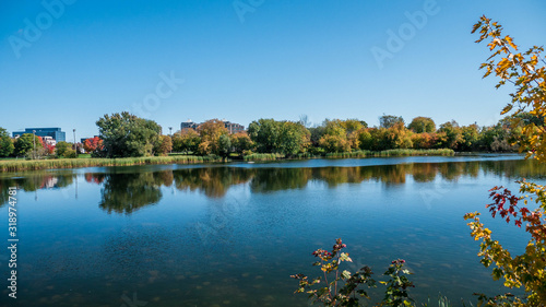 lake, water, landscape, sky, nature, river, autumn, blue, tree, park, tree, forest, summer, duck pond, green, city, beauty, outdoors, tranquil, fall, house, calm, view, cloud