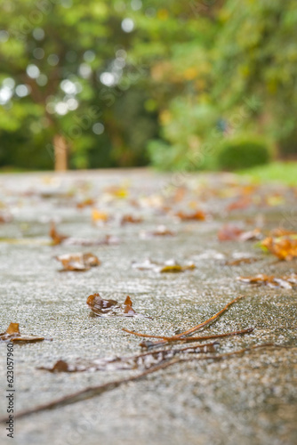 Fallen leaves on the ground in the rain, natural background. with bokeh background, selective focus. evening environment