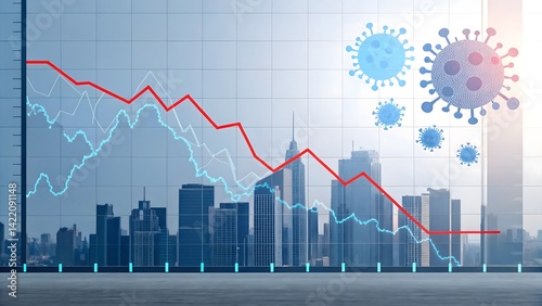 Falling financial chart with virus icons and cityscape during global economic crisis