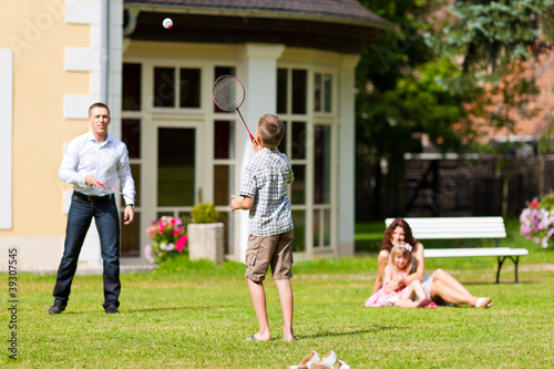 family, home, house, badminton, summer, real estate, people, father, mother, children, play, villa, mother, father, children, children, daughter, sun, couple, married, marriage, human relationships, young, happy, happiness, smiling, smile, sunny, lawn, grass, meadow, green, country, rural, outdoors, to sit, sitting, playing, run, running, bench, mortgage, property, real estate, together, caucasian, 4