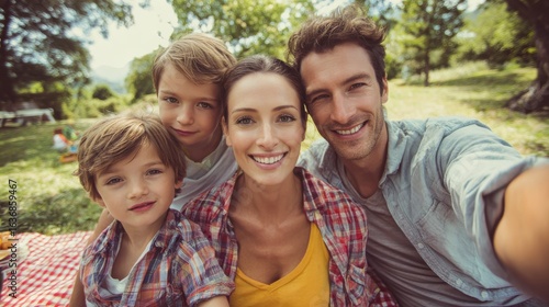family leisure and technology concept happy mother father and two little sons having picnic and taking selfie at summer park no logos no brands ar 169