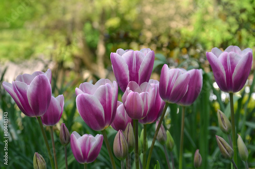 Family of blooming 'flaming prince' tulips. Beautiful variegated purple and white tulips bloom on flowerbed in spring.Gardening concept. Free copy space.