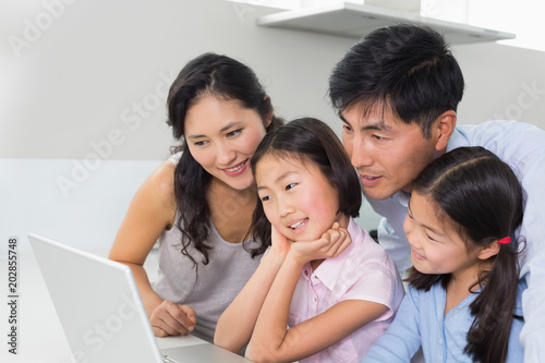 lifestyle, technology, computer, wireless, using, comfortable, leisure, browsing, cyberspace, laptop, notebook, sitting, happy, dark hair, black hair, childhood, casual attire, smile, pretty, house, home, apartment, domestic, mother, father, daughter, togetherness, sibling, sister, together, kitchen, learning, relaxation, looking