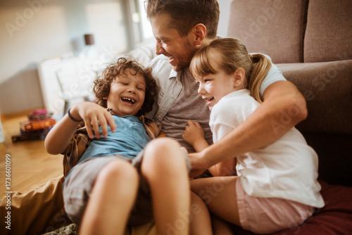 people, family, father, children, girl, boy, happiness, emotion, joy, laughter, indoor, activity, love, togetherness, bonding, playful, home, cosy, relaxation, fun, smiling, childhood, parenting, care, connection, leisure, modern, technology, lifestyle, warmth, lifestyle, family time, together, game, entertainment, joyful, playtime, interaction, creativity, homelike, affection, nurturing, support, oneness, engagement, sibling, copy space