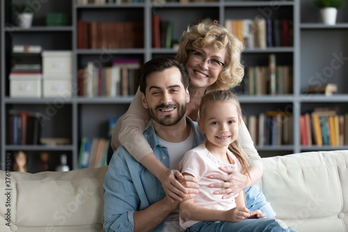 Family portrait smiling mature grandmother wearing glasses hugging adult son and little granddaughter sitting on cozy couch in living room, happy mature woman, young man and girl looking at camera
