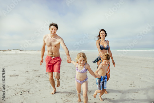 people, family, sandbeach, daytime, caucasian, white, mother, father, daughter, son, sibling, adult, children, fun, joy, togetherness, leisure, playful, bonding, quality time, happiness, emotion, sunshine, vacation, recreation, family outing, parenthood, running, playing, casual clothes, holiday, youth, lifestyle, smiling, love, childhood, 4, man, male, woman, female, girl, boy, lifestyle