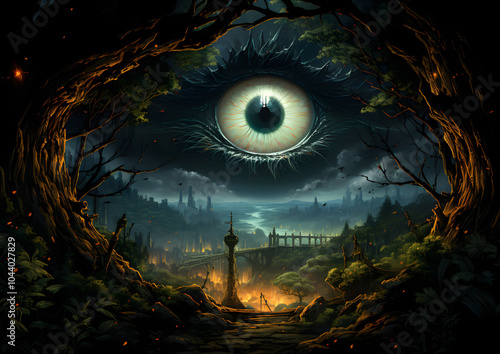 Fantastische Landschaft mit gigantischem Auge und mystischer Stadt - Ki generiert