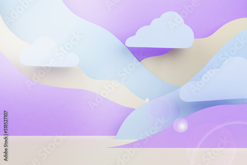 Fantasy cartoon landscape - abstract scene mockup with paper clouds, mountains in blue, violet, white color, sun beam glare. Template for advertising, design, card, presentation of cosmetic, poster.
