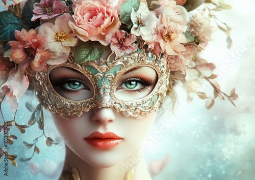 Fantasy girl wearing a vintage mask adorned with floral hair accents