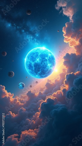Fantasy landscape of a glowing blue planet with surrounding stars