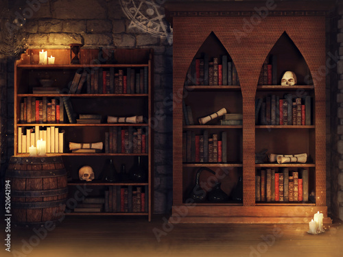 Fantasy magical library with books, scrolls, candles, and skulls at night. 3D render.